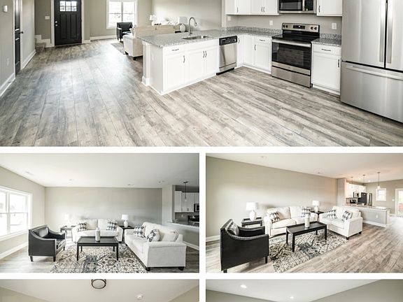 The open concept main floor is perfect for entertaining, featuring a stunning kitchen with elegant granite countertops and four 26" black counter-height bar stools. The spacious living area provides an inviting space for family and friends to gather.