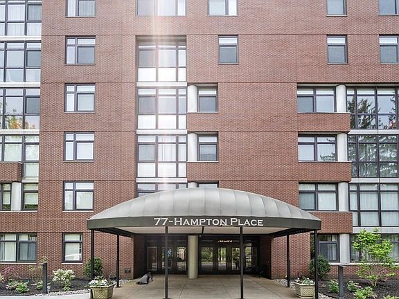 Spectacular sun-filled corner unit at Hampton Pl. Livingroom with walls of glass, high ceilings, and wood floors. Lovely fireplace den with built-in bookcases. Stylish eat-in kitchen renovated in 2010. Large handsome office with walls of built-ins. Spacious 2nd bdrm with en-suite bath and walk-in closet. The main bedroom has two custom-built walk-in closets. Spa-like bath. Two garage spaces. Laundry room. This secluded complex surrounded by conservation land is plush with tailored landscaping. There is an indoor and outdoor pool, clubhouse and gym. All are in close proximity to "The Street" including restaurants, shopping, and easy access to highways.
