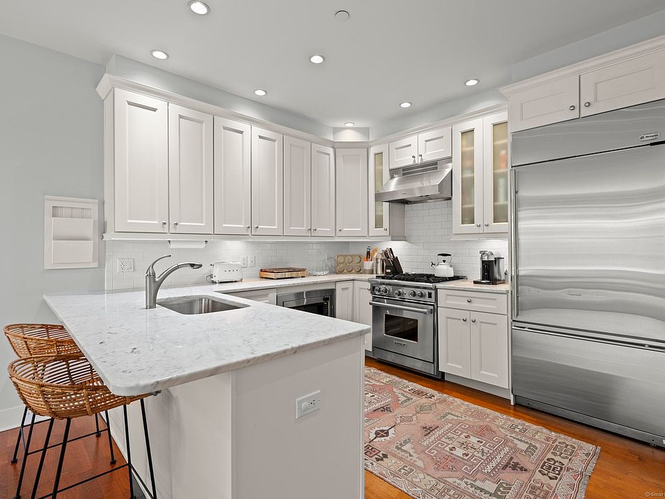 Primary suiteCozy gas fireplaceHigh ceilingsPrivate balconyBreakfast barMarble countertopsWalk-in closet