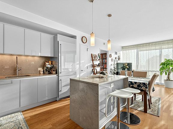 Floor-to-ceiling windows fill the space with natural light and showcase sweeping views of Liberty State Park and Paulus Hook Marina. From the living room, enjoy magnificent sunset views that paint the sky each evening.