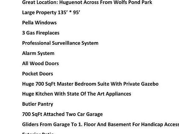 What a spot. When I told the owner 11 years ago to drive by the home, he made an instant offer from his car and had Acceptance within 2 days. Today he is ready to move to Florida. So here is your opportunity to own this unique, all brick huge (68'*40') ranch with an attached 700 sqft 2 car garage with stair gliders for handicap access and features too numerous to mention. Just as a teaser: A 17'5'' ''Walkabout'' closet inside a 700 sqft master bedroom suite that even has a unique personal bricked gazebo. It is sitting on a huge oversized very private lot that is across the street from Wolfs Pond Park and is waiting for a new family to make it their last home on Staten Island. Check out the video, pictures and floorplans. If you like what you see, drive out at 8pm at night, park in the front of the house with your eyes closed and your windows open. If you can imagine yourself living here, dm or call me to make a private appointment. Don't wait! There is only one.