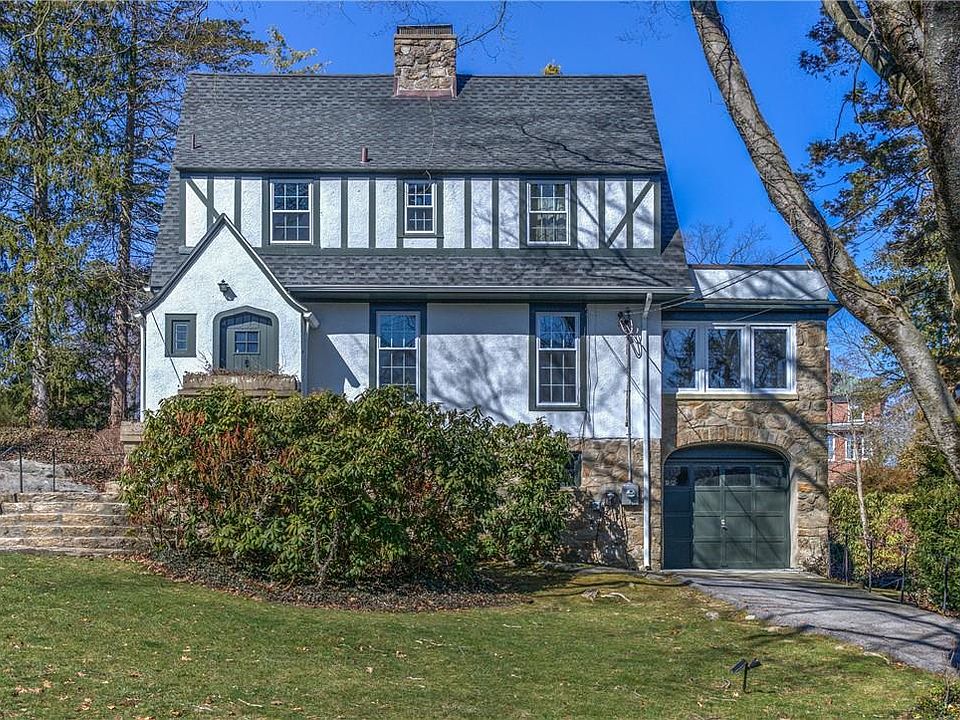 Charming Tudor sits high on a hill with large windows and tree top views. This property offers two and a half stories of living space situated on a corner lot size of .34 acres. Your family and loved ones will enjoy the spacious yard, perfect for family gatherings! First level large living room with wood burning fireplace, sunny kitchen, few steps down with side door to large property, spacious formal dining room with sliding doors to patio and backyard, family room/den or home office. Second floor: main bedroom with walk in closet, door to balcony and hall bath, three more bedrooms and steps to full attic bonus space. Basement additional square footage, half bath, laundry area, storage, entrance to attached one car garage, EV charger. Close to all, shopping, train and much more! Additional Information: Amenities:Storage,ParkingFeatures:1 Car Attached,