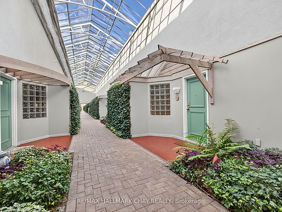 Full of character and charm, this one of a kind condo building features a well designed plant-filled atrium that brings natural beauty indoors. Quiet and sought after, this location can't be beat. Walk to a full array of amenities at Mill St shopping. Enjoy low maintenance fees and worry free living year round with no snow to shovel or grass to cut, a designated parking space, guest parking and access to amenities including a party/meeting room and library/fitness room. This warm and inviting one bedroom suite offers everyday carefree living with hardwood floors throughout, a good size eat in kitchen with 2 year old appliances and a quaint living room with walkout to a sunny patio perfect for relaxing and barbecuing. Enjoy the benefits of in-suite laundry and a large insulated loft storage area with easy access. Comfort, convenience, and everything you need in a friendly small-town community!