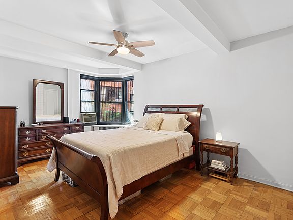The king-sized bedroom with a ceiling fan and garden views is a serene retreat, complemented by a tiled windowed bathroom with a Kohler pedestal sink. Throughout the apartment, you'll find pre-war details such as herringbone and parquet wood floors, adding a touch of timeless charm. Ample storage is available with four closets and large built-in storage unit.
