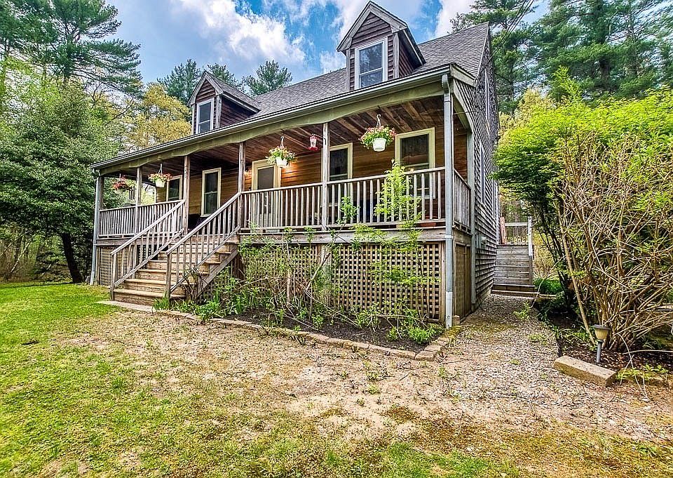 NEWLY Updated and Charming! Large Cape style home set on a very private lot of 1.36 acres!! Huge Finished Basement! Enjoy the sunrise on your Lg front covered porch upon the wooded frontage. Lots of natural sunlight enhanced by the skylight front entrance! Open concept Main level with refinished hardwoods in formal Dining Room, leading into a spacious kitchen with Lg island & tile flooring. Entertain & relax with the Wood Burning Fireplace Livingroom with new Pergo floors, leading to a NEW Slider with a Lg NEW Rear Deck! Enjoy a Main Level Private office/ Guest room, NEW Pergo flooring & Glass pocket doors. 1st Fl Full bathroom has a beautiful updated white vanity, countertop, lighting, faucet, toilet and Pergo floor. Includes first floor laundry. 2nd floor -New carpet, 3 Lg bedrooms all with Spacious Closets! LG front to back Main bedroom, Center Hall Full Bathroom is UPDATED with a Lg vanity, countertops, faucet, lighting, toilet. Private Long driveway, huge private yard, firepit.