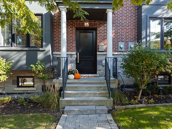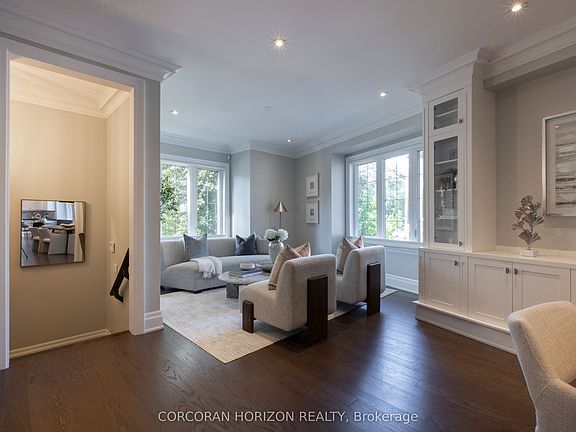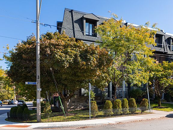 Elegant End-Unit Freehold Townhome in Prime Leaside. Perfectly positioned across from Trace Manes Park, the Leaside Library, and the Community Centre, this stunning end-unit freehold townhome offers over four levels of impeccably designed living in one of Toronto's most coveted neighbourhoods. Steps to the boutiques, cafés, and restaurants of Bayview Avenue, this home combines timeless sophistication with the ease of modern, low-maintenance living-ideal for professionals or families seeking space, style, and convenience. The open-concept main floor is bright, elegant, and exceptionally functional. The chef's kitchen features Thermador stainless steel appliances, a gas range, a massive granite centre island, a Parisian-style banquette for morning coffee or casual dining and French doors opening onto the deck. Thoughtfully designed custom built-ins throughout the kitchen, dining, and living areas offer abundant concealed storage while maintaining a clean, contemporary aesthetic. The marble gas fireplace anchors the main floor in warmth and charm. A chic powder room completes the main level. Upstairs, the second floor features three bright, spacious bedrooms, one with a modern 3-piece ensuite. The large family bath with double marble vanity, a full laundry room and two linen closets round out this level. The third floor is devoted to the luxurious primary suite, with two walk-in closets, a serene den or office, and a spa-inspired ensuite with two marble vanities, a glass shower and freestanding tub. Over 900sf of luxury all to yourself! The finished lower level includes a large recreation room, generous storage areas, and an immaculate 1.5-car garage equipped with a 240V EV charging outlet, built-in bicycle racks, and automatic door. No more maintenance, landscaping & snow-removal included in low monthly fee. Beautifully appointed, intelligently designed, and located in the heart of Leaside, this home truly offers it all!