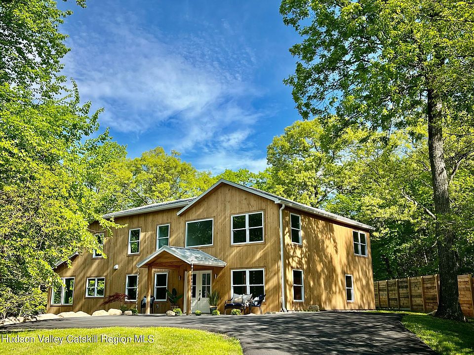 Nestled on a tranquil country road, discover a meticulously reimagined and expanded 3-bedroom, 3.5-bathroom home crafted by a renowned Hudson Valley design and build team. Every detail in this residence, from finishes to fixtures, has been carefully curated to optimize both form and function, resulting in a truly unique home where quality and meticulous detail shine in every room. The main floor welcomes you with an open layout featuring abundant windows that flood the space with natural light. The large living room opens to a back deck, offering serene views of the private wooded setting with seasonal sunsets and glimpses of the Catskills. Adjacent is a spacious butler's pantry, complete with a sink, beverage cooler, and ample cabinet space. The kitchen boasts a striking quartz waterfall island with seating for four, seamlessly flowing into the dining area. Across the island, a custom-built range hood complements the all-new stainless steel appliances. Towards the front of the house on this level, discover a charming office and den area next to the powder room. Ascend to the upper level, where the primary suite features soaring ceilings, a warm shiplap wood accent wall, and two walk-in closets. The spa-like bathroom is adorned with marble floor tile, fluted wall tile, a double vanity, and an impressive glass shower. Two additional spacious bedrooms share a stunning hall bathroom with a tub. For added convenience, the second floor hosts a well-appointed laundry room. The finished lower level offers many potential uses with two inviting rooms, perfect for family and friends. Enjoy the ambiance of an electric fireplace set in the original brick chimney, a full bathroom, and direct access to the backyard with an auxiliary rear driveway. The home is equipped with new electric, heat pump heating/cooling with zone controls, and an efficient hybrid electric/heat pump water heater. Designed with sustainability in mind, the property is extremely efficient, and fossil fuel-free, with spray foam insulation, a new roof, new windows, new doors, and natural wood siding. Located in one of the most sought-after neighborhoods in the New Paltz Central School District, the house is conveniently close to the Village of New Paltz, Rosendale, and Kingston restaurants and attractions. Explore the nearby Hudson River or embark on a picturesque 5-minute drive to the Shaupeneak Ridge for hiking adventures.
