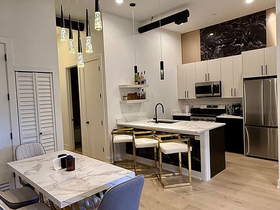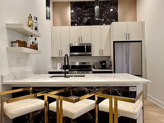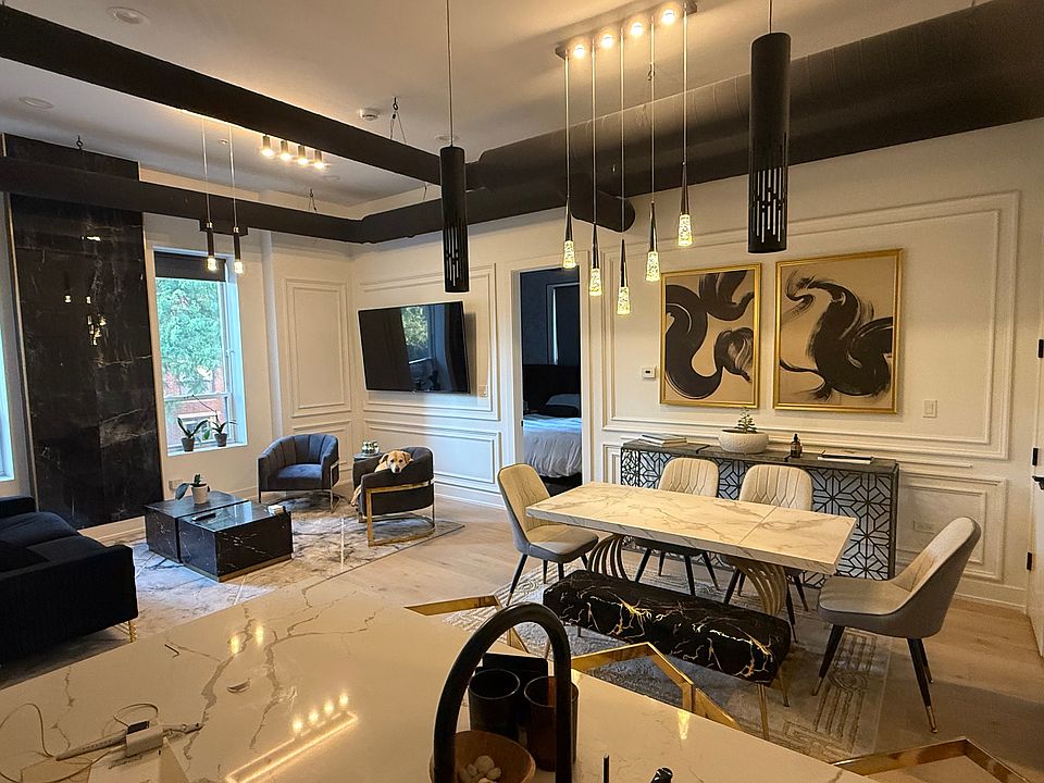 Designer finishes and furnishings: custom millwork, flat-panel cabinetry, marble accent walls, sleek quartz countertops, stainless steel appliances, and curated luxury furniture that complements the space.