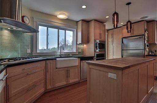 Walk to school, biking trails, and shopping! This center entrance colonial has many recent updates. Kitchen w/bamboo flooring, concrete counters, recessed lighting,center island,built-ins. Brightly lit living room & dining room.Half bath. Second level four bedrooms w/ hardwood floors, full bath. Carpeted lower level w/ family rm office,exercise rm.,full bath. Full deck, newer roof, water heater, fenced yard. Hardieplank exterior.