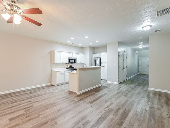 Center islandOpen layoutWood-look flooringDouble-basin sinkOver-the-range microwaveCeiling fan