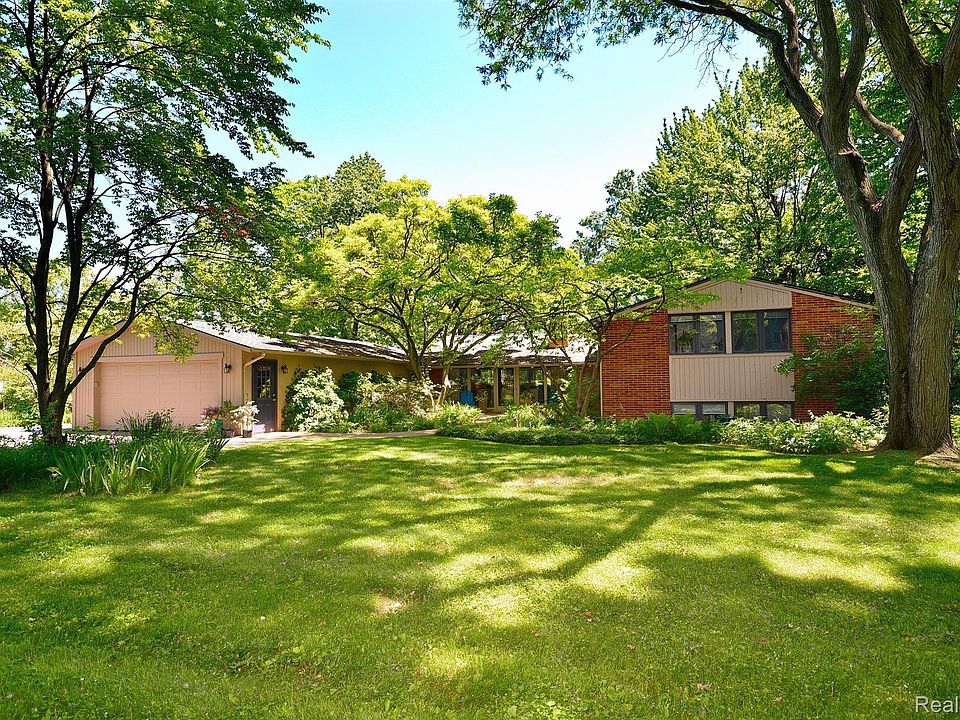 Experience the beauty and serenity of a Mid-Century Modern home, nestled on over and acre of lush, picturesque land. Surrounded by beautiful plantings, ferns, flowers, and majestic trees, this property offers a unique tree house-like ambiance. 4 bedrooms and 3.1 bathrooms, provide ample living space with total square footage over 3800, including the walk out lower level. Open floor plan with glistening hardwood floors throughout the first floor. Expansive kitchen with white cabinetry, Sub-Zero refrigerator, granite countertops, Ge Profile appliances, and a stainless gas cooktop on a large island. Double sided natural fireplace seamlessly connecting the great rom and dining room. Attached garage accommodating 3 - 4 cars. First floor offers a bright and airy kitchen, dining room, great room, powder room, and laundry. Half a staircase up takes you to a private primary bedroom with walk-in closet and en-suite bath featuring a generous shower and double sinks. On a separate level are the three additional bedrooms sharing a bathroom with tub and double sinks. The lowest level is a walkout with abundant natural light, mostly finished and has the 3rd full bath. Bloomfield Hills Schools. This home, surrounded with natural beauty creates an ideal retreat for those seeking comfort and convenience. Don't miss the opportunity to own this extraordinary property in a prime location in Bloomfield Township!