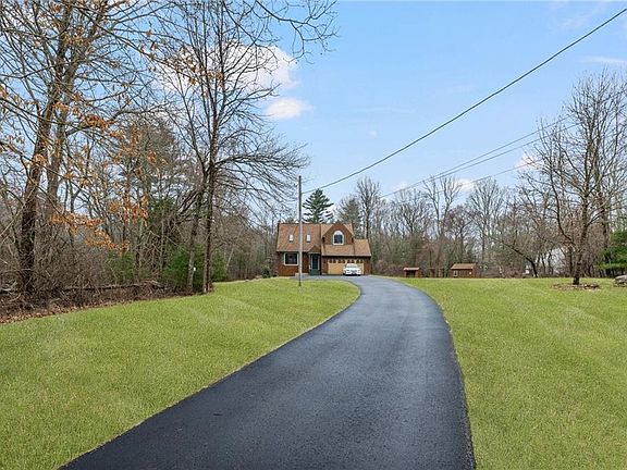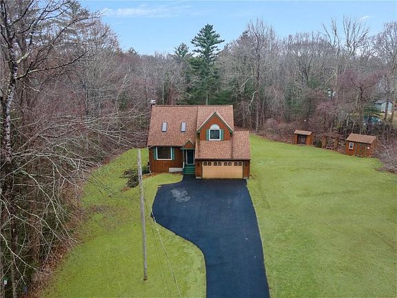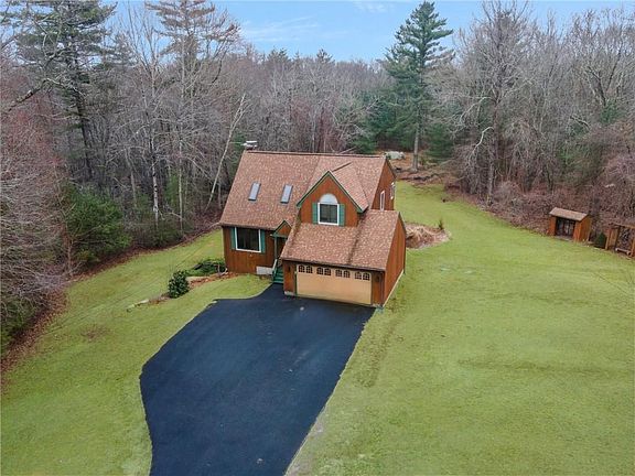 Set back on a quiet, wooded 4-acre lot right along the Scituate line, this 3-bedroom, 2-bath contemporary home offers the kind of privacy and space you've been looking for. As you pull down the long driveway, the house sits peacefully surrounded by mature trees giving it a private, tucked-away feel while still being close to everything you need. Inside, the freshly painted main living area features cathedral ceilings, skylights, and a wood-burning fireplace - creating an open, bright, and warm living space. The kitchen has granite countertops, stainless steel appliances, and plenty of room for cooking and entertaining. Just off the kitchen is a dining area that opens to a freshly stained back deck—ideal for enjoying the quiet surroundings or hosting friends in the warmer months. Upstairs, the full bathroom includes a tiled shower and a luxurious soaking tub. The bedrooms are well-sized with good natural light and the primary bedroom also features cathedral ceilings and dual closets. The lower level has a walkout and large, unfinished space with great potential—it could easily be converted into a family room, home office, gym, or in-law space. There’s also a two-car garage and a young roof. Whether you’re looking for privacy or just a place to put down roots, this home offers a solid foundation with plenty of potential in a beautiful, peaceful setting.