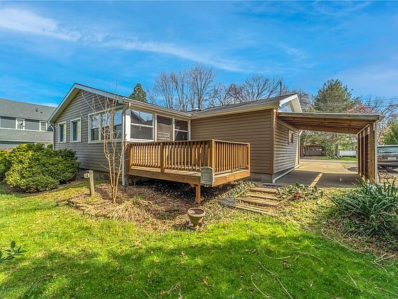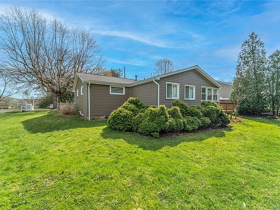 This quaint home in the village of Harmony, that was founded in 1804, offers more than just serene, easy living.The 3 bedroom, 2 full bath ranch is within walking distance of small shops, restaurants, and the Harmony Inn.The flat front yard has a simple decorative wood fence.The landscaping has been well maintained through the years for beauty, yet simplicity. Level entry into the home, there is fresh carpet and paint for move in readiness. Pass thru the living room area into the open dining/kitchen area with its country cottage feel.The back family room is light and bright with sliding glass doors that open onto an enclosed back porch and a deck. Plenty of storage in the lower level and the oversized garage. The lower level also has a full bathroom with a shower and an extra family room/den.The flat concrete parking pad is large enough for at least 4 vehicles.The oversized garage has excessive storage plus an extra side carport for sporting equipment, motorcycles or extra vehicles.