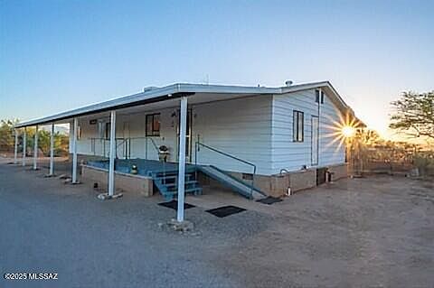 Enjoy the gorgeous sunsets, mountain views, privacy, and wildlife in this cute property.New HVAC in '24, new septic system in '23, and new covered patio deck just built. The neighborhood has no HOA, paved county maintained roads, horses are allowed per zoning and it's located in the Vail School District. There's an impressive 20x60 covered open barn, and water and electric all over the property. It's ready for your horses!! Already cleared and ready for you to put in an arena. Fenced and cross fenced on 1.5 acres, bordering state land and access for riding. New dishwasher, kitchen sink and faucet. Both bathrooms have been updated with new flooring and vanities. There are extra storage/out buildings, with utilities set up, making them a great workshop, hobby space, and tack room.