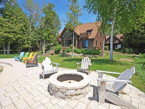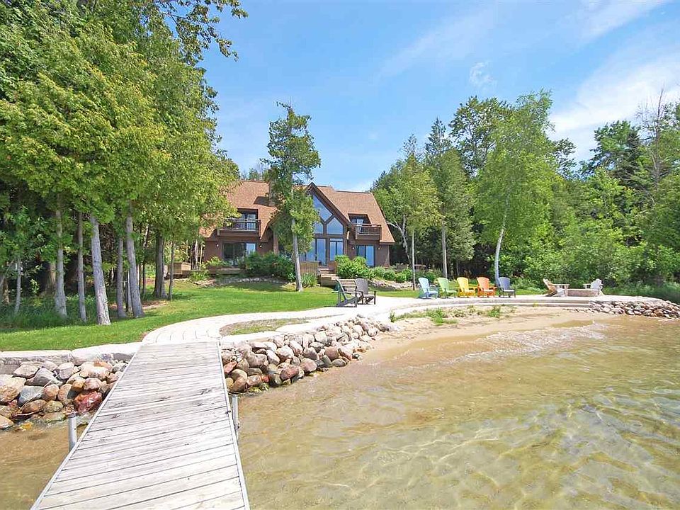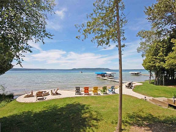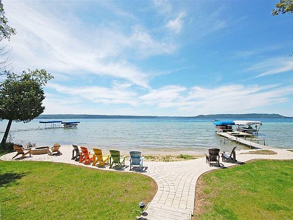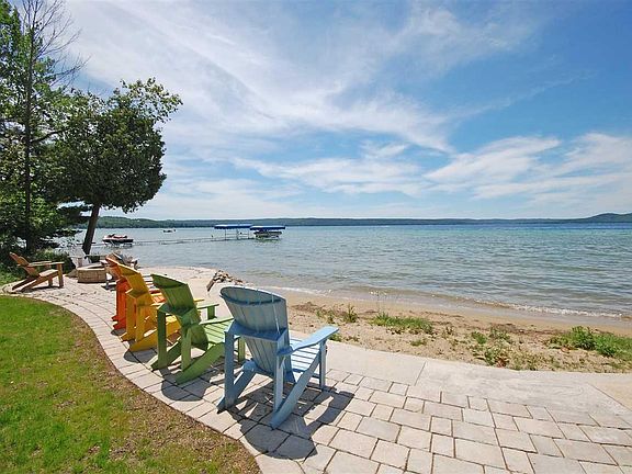 Unique and beautiful home on Big Glen Lake with picture perfect Alligator Hill and sunset views. There's both a main and guest home with this property, and between the two, there are six bedrooms and four and one half bathrooms. A large deck is perched on the lake side of the home, with ample stone patio space and a sandy entry beach. Inside the main home, a soaring ceiling and fireplace envelope you, with classic wood beams lending a warm, timeless feel. The living room (with wine bar), dining room, and kitchen space spill in to one another, allowing for open concept living. Also on the main floor is a large master suite with lake views, sliders to the deck, a fireplace, ship lap, and a fully renovated en suite bathroom with a large, walk in shower. Natural light spills in to the bathroom from the skylights, giving it a spa-like fee. A half bathroom, and large/laundry mudroom connecting to the outside (for post-lake convenience) complete this level. Upstairs there are two more oversized bedrooms (each with their own deck with fabulous views!) and a spacious bathroom between those two bedrooms. Journey steps from the main house to the guest house patio sliding doors, which open up to a light and airy living space, rec area, a full kitchen, and three quarter bathroom in the main level. Upstairs in the guest house, another three bedrooms, full bathroom, kitchenette area, and an additional seating nook with water views complete the space. At the back of the guest house is the two car garage, allowing for year-around living. A long driveway, perfect for parking many cars, also lends itself to fun gathering of all your family and friends to enjoy this dreamy, lakeside retreat!
