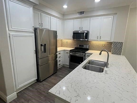 Fantastic upgraded 2 story condo inside the impeccable STRATHMORE COMMUNITY. This outstanding condo is well situated for maximum privacy. Laminate flooring throughout, pleasing 2-tone paint, LED lighting, window shutters, and cool A/C. Kitchen has been upgraded with quartz counters, newer stainless steel appliances including refrigerator, and tile backsplash. Downstairs 1/2 bath with large storage closet, upstairs stackable W/D, 3 bedrooms with ceiling fans, common area full bathroom with shower in tub. Primary bedroom and bathroom with quartz double sink, walk-in shower, and walk in closet. 2 car attached garage. Strathmore amenities include 3 gated entries, pool/spa, kids park, several large grass areas, gazebos, and located across the street from Victoria Gardens!