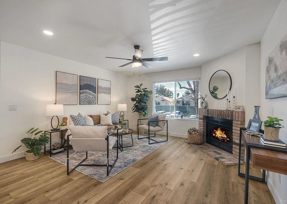 GORGEOUS remodeled 1BD/1BA you do not want to miss! This stunning end-unit home is perfectly situated upstairs with no one below and offers sweeping views of the La Costa hills. Light & bright, open-floor plan, this home has been Recently renovated from top to bottom featuring all new windows, flooring, kitchen, bath, appliances, and fixtures throughout. Enjoy cozy evenings by the fireplace and your own one-car garage. plus assigned spot. Enjoy resort-style living in this gated community with tennis courts, gym, pool, spa, and sauna, BBQ area and all conveniently located near beautiful trails, parks, and premier shopping centers.