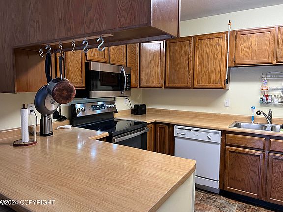 Great townhome with living room and kitchen downstairs, no need to carry your groceries upstairs. Gas Fireplace. Sliding door to nice open yard. Large one car garage, 3 bedrooms up. HOA replaced roof 5 years. Water Heater 5 year old. HOA dues cover Water/Sewer, exterior maintenance, driveway, roof, paint, snow removal, lawn care. Secured RV parking & tennis courts. Laminate floors downstairs.