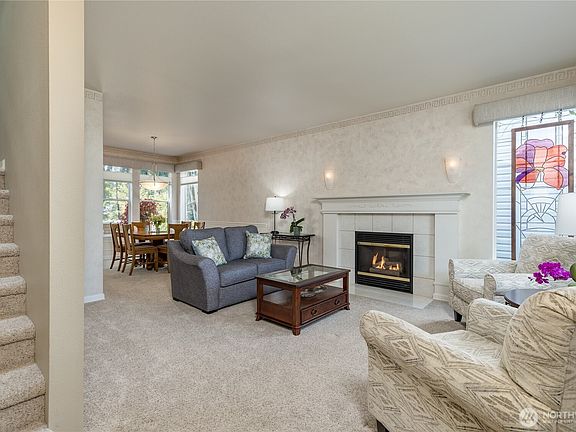 Welcome to this Riverwalk Condominium, tucked away on a quiet cul-de-sac and backing up to the scenic Puyallup River! Enjoy peaceful views from nearly every window and direct access to the walking trail just steps from your expansive deck (with retractable awnings!), one of the largest in the community. The inviting layout features a bright kitchen with white cabinetry & hardwood flooring, plus formal living & dining areas with a cozy gas fireplace. Main floor bedroom or office has adjacent full bath, perfect for guests. Upstairs, the spacious primary suite boasts river views, walk-in closet & double sinks. Central A/C, wired for generator, and HOA-maintained roof, siding & landscaping. Close to parks, trails, and charming downtown Sumner!