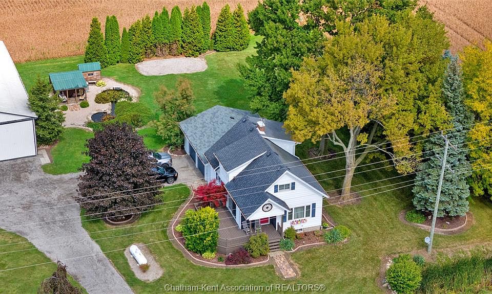 7703 Base Line is where country living meets endless opportunity. Sitting on 1.63 acres with a circular drive and mature trees, this property is set up for you to live, work, and play — all in one place. Outside, there’s no shortage of space or outbuildings — a 25x40 insulated shop with additional drive shed space, perfect for your business, hobbies, or projects. With 400-amp service across the property (100 Amps to the house, barn, and shop separately) and 3-phase power available at the road, you have the flexibility to grow and build whatever you need. Two grain bins provide extra storage, and the barn — with its uniqueness and a beautiful willow tree behind — is ready for you to make your own. There are peaceful spots to sit and take in the view, plenty of room to work, and A1 zoning that allows animals and the chance to create your ideal lifestyle. It’s the perfect amount of land — enough to do what you want — whether that’s a hobby farm, home-based business, or private country retreat. The home itself is full of character, with hardwood floors, an updated kitchen/dining area, main floor powder room, full bath upstairs, and three bedrooms — plus a spacious 29x23 attached garage. Add in the koi pond, mature trees, and excellent road exposure, and you’ve got a rare setup that combines privacy with visibility. Just minutes from Wallaceburg, Chatham, and Dresden, this property gives you country peace with quick access to town. Home is Where the Hart is!