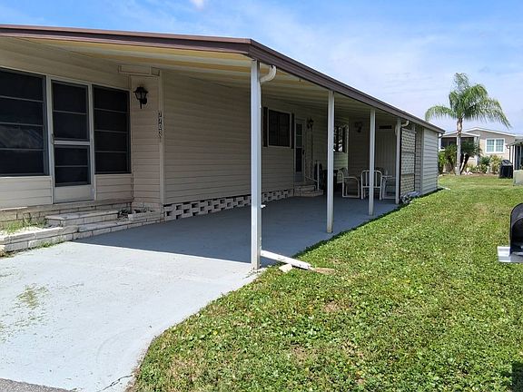 Motivated Seller! Price Reduction. Located in Club Wildwood a 55+ active community in Hudson, Florida, this partly furnished mobile home offers a spacious and well-maintained living space of 1056 sqft, including 2 bedrooms and 2 bathrooms, with ample storage and closet space throughout. The master bedroom features a large walk-in closet an en-suite with a walk-in shower, while the guest bedroom has a double closet. The second bathroom includes a tub shower for guests. The home boasts a large, open kitchen and a sizeable, enclosed lanai with tinted windows, perfect for entertaining. It comes with a carport that fits 2 vehicles, and a storage shed equipped with a washer and dryer with plenty of storage space. The roof is overlay metal top. The community is pet-friendly, allowing up to two pets per home, with each pet weighing no more than 30 lbs. A park application with background check is mandatory to ensure the safety of all residents as well as a valid driver's license or ID. The monthly lot leasing fee of $755 which includes landscaping maintenance, twice-weekly curbside trash pickup, basic cable services from Spectrum, with loads of amenities including clubhouse with many gatherings, pool, dog park, shuffleboard, pickleball, catch & release ponds.