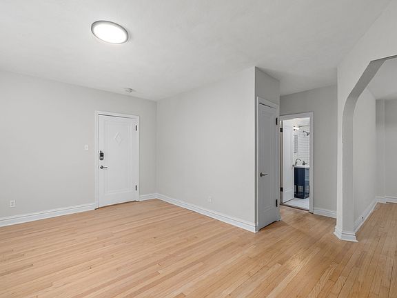 Inside, you'll find bright, freshly painted rooms with original hardwood floors throughout. The modern kitchen features crisp white cabinets, subway tile backsplash, stainless-steel appliances (including a gas range and built-in microwave), and sleek quartz-style countertops. The spacious living and dining areas are filled with natural light, while the renovated bathroom offers contemporary fixtures and classic tilework.