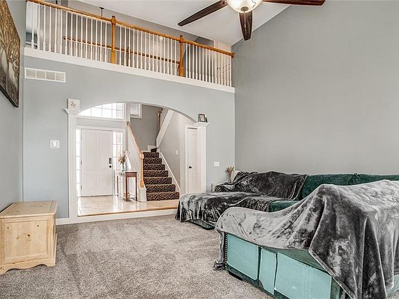 PRICE IMPROVMENT!! Located in the Summit Wood community (KC address, Lee's Summit schools), this solar powered 1.5 story home is ready for its new owners. Situated on a peaceful cul-de-sac, its location provides easy access to University Health Hospital, St. Michael's Catholic High School, shopping & Hwy 470. Step inside to discover a spacious open-floor plan highlighted by a stunning 2-story great room adorned with a gas fireplace and abundant natural light. You will enjoy the main level master suite, an elegant dining room with hard wood floors that flow seamlessly into the breakfast room and kitchen. The first floor laundry is conveniently located off the kitchen. Upstairs, a private guest suite with a walk-in closet and bath awaits, complemented by two additional bedrooms with walk-in closets and a shared bath featuring separate vanity areas. A charming catwalk overlooks the great room, adding a touch of architectural elegance.