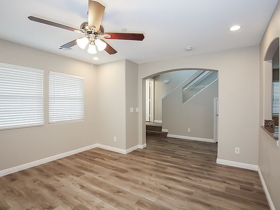 This three-bedroom and two-and-a-half-bathroom Las Vegas, NV rental home has a rear-loading driveway and a beautiful balcony overlooking the peaceful front yard. Step inside this two-story smart home to find a spacious 1,451-square-foot interior, with wood-look vinyl flooring and neutral-colored walls in the living room for a modern feel. Sliding glass doors leading outside flood this space with ample natural light. The kitchen has an attractive tile backsplash, quartz countertops, and convenient inset ceiling lights. There's extra storage space in the pantry. Highlights of the upstairs primary suite include a large walk-in closet and a private bathroom with an extra-long vanity. Access the balcony via sliding glass doors. Come tour this pet-friendly Las Vegas, NV property on a private walk-through today!