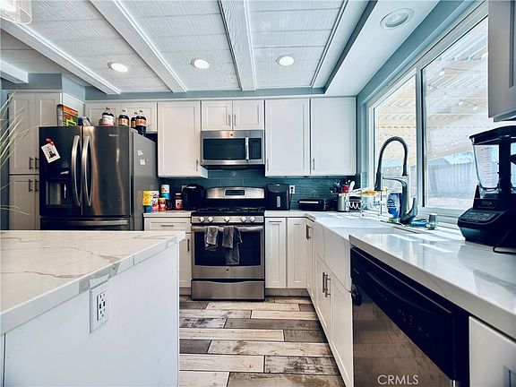 The updated kitchen shines with quartz countertops, custom cabinetry, and stainless steel appliances.