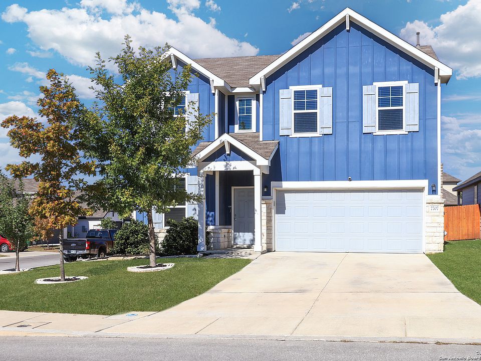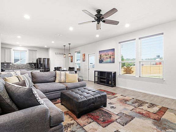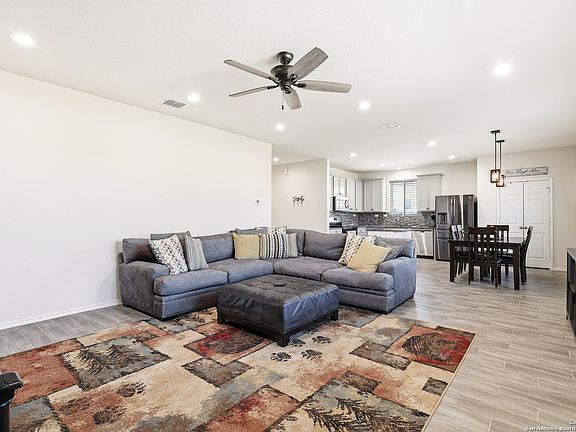 Corner Lot Alert! Nestled in desirable Boerne and surrounded by the stunning Texas Hill Country, this home truly checks all the boxes. The curb appeal is has a light stone exterior accented by a vibrant front door and matching shutters that give the home a fresh, inviting look. Step inside to an ideal floor plan featuring a first-floor full bath and an open layout perfect for everyday living or entertaining. The island kitchen is a standout, offering stainless steel appliances, built-in microwave, tile backsplash, granite counters, and beautifully molded cabinetry-all overlooking the breakfast area and living room. Neutral, easy-to-maintain tile flooring flows seamlessly throughout the main level. Upstairs, you're greeted by a huge second living area-perfect for a game room, media space, or additional lounge area. The spacious primary suite includes a double vanity with quartz countertop, walk-in shower, and separate soaking tub. Two generously sized secondary bedrooms share a well-appointed full bath with quartz vanity, linen closet, and added wall cabinetry for extra storage. The oversized backyard features a covered patio and privacy fence, ideal for outdoor gatherings or quiet evenings. Additional upgrades include a sprinkler system, water softener, kitchen sink/refrigerator reverse osmosis system, upgraded recessed lighting throughout, and ceiling fans in much of the upstairs. Conveniently located near shopping and just a short drive to San Antonio or the Hill Country, this home offers both comfort and accessibility. Plus, the neighborhood pool is perfect for cooling off on warm Texas summer days.