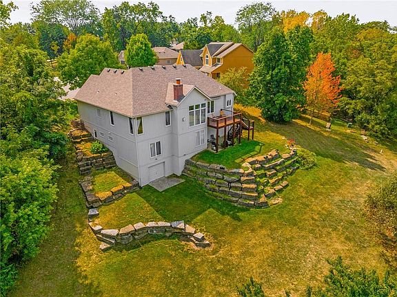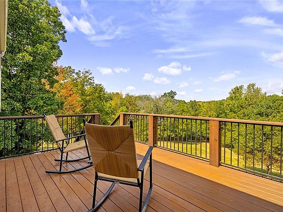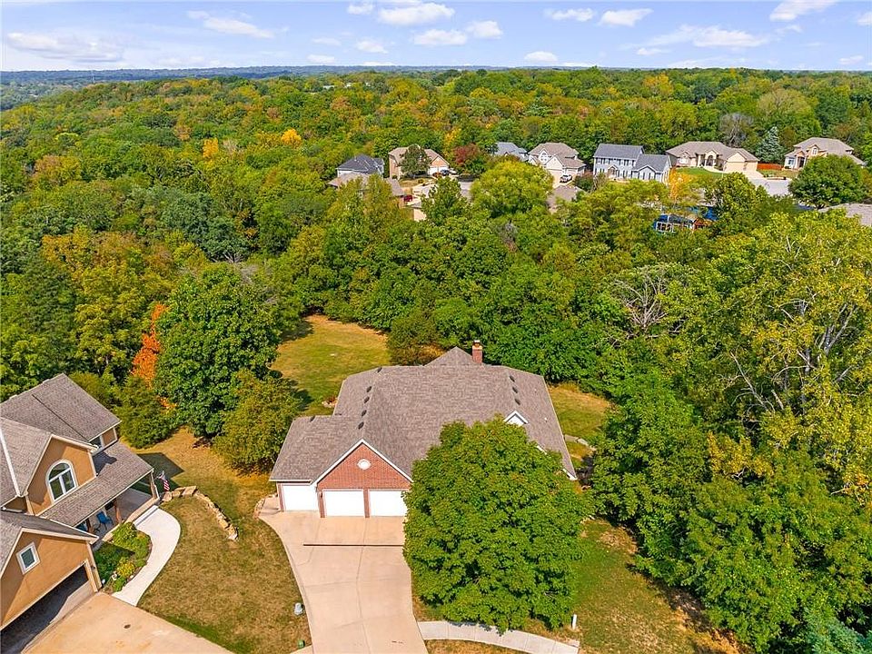 Rare find! Custom, quality built reverse 1.5 story home on a private 1+/- acre cul-de-sac lot! Homes in this sought after neighborhood don't hit the market often and this one offers the ultimate backyard privacy! No HOA dues and Lee's Summit schools! Inside, you'll find an open and spacious floor plan with soaring ceilings, a great room with a gas fireplace, and a wall of windows overlooking the serene backyard with tons of wildlife. The gourmet kitchen features hardwood floors, walk-in pantry, granite countertops, and a breakfast bar - perfect for gatherings and everyday living. The main floor primary suite includes a walk-in closet, a spa-like bathroom, dual vanities and a tile shower. Additional main level highlights include a formal dining room, large office with built-ins, laundry room, and guest half bath. The finished, walkout lower level is designed for both living and entertaining with a second kitchen, family room with wood burning fireplace that can heat the house, plus two spacious bedrooms: one with an en suite bath and an additional full bath in the hall. A massive storage area could easily be converted into fourth bedroom or hobby space. Unwind on the deck beneath the retractable awning, surrounded by serene privacy and exceptional outdoor living. Additional lower level garage for mower or workshop. Newer roof, HVAC and water heater. Conveniently located close to highways, hospital, shopping, and dining.