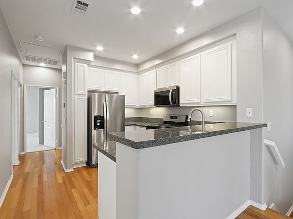 The interior features fresh paint and brand-new carpet throughout. The kitchen shines with new stainless-steel appliances, including a refrigerator, stove, microwave, and dishwasher, along with elegant granite countertops and white cabinetry. A brand-new washer and dryer are conveniently included inside the unit. The home also features a new central air conditioning unit, new window blinds, updated toilets, and modern ceiling fans.