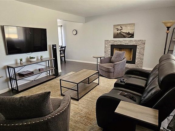 Excellent condition and prime corner lot. Move in ready. Spacious, tiled living room with a modern marble ledger fireplace. It has new kitchen with premium self-closing cabinets with new quartz countertops and single basin, stainless steel sink and pull-out faucet. New, matching stainless-steel appliances including stove, microwave and dishwasher. Large, carpeted bedrooms with generously big closets. Remodeled bathrooms. Central air and heat. Dual pane windows. Wi-Fi garage with finished walls and epoxy painted floor, door opener, thermostat and sprinkler timer for drip system. Newer roof. Oversize garage. Attractive and well-maintained corner, fully fenced with chain link, multiple trees that provide shade to the home and attractive flower gardens and bird bath. Lot has plenty of room for RV parking. Covered patio/porch in the front and back