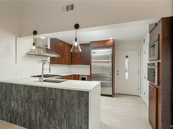 Inviting 2-bed, 2-bath townhome with a well-appointed kitchen showcasing Viking/Thermidor appliances, wine cooler, and built-in espresso machine. Practical features include a custom pantry and quartz countertops. The living area is cozy with a floor-to-ceiling slate fireplace. Both bedrooms offer functional custom closets. The master bathroom boasts a stone shower with Kohler rain/waterfall head and body sprays. Recent updates include new paint, lighting, a tankless water heater, and HVAC. This townhome is refreshed and ready for comfortable, modern living.