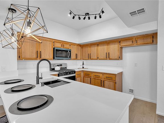 Want STYLISH, EASY LIVING steps away from Summerlin? Inside this GATED Adagio community—with RESORT-STYLE AMENITIES including a POOL & SPA, FITNESS CENTER, SCENIC WALKING PATHS, and PICNIC AREAS—a REIMAGINED GEM awaits. Step inside to VAULTED CEILINGS, where black-and-oak–inspired pendants set the tone for an OPEN FLOORPLAN that connects kitchen, dining, and living with effortless flow. The kitchen showcases OAK CABINETRY with BRAND-NEW BLACK HARDWARE, delivering a warm, modern contrast. A BRAND-NEW, DESIGNER-TILED LED FIREPLACE anchors the great room with a clean, contemporary focal point. The DUAL-ACCESS BALCONY extends living outdoors—with doors from the DINING/KITCHEN area and the PRIVATE PRIMARY SUITE—perfect for morning coffee or sunset wind-downs. In the primary suite, enjoy a spa-inspired bath with a soaking tub and separate shower for a calm, retreat-level finish. All of it sits steps from Desert Shores and the Summerlin lifestyle. This HOME is a must-see!
