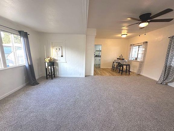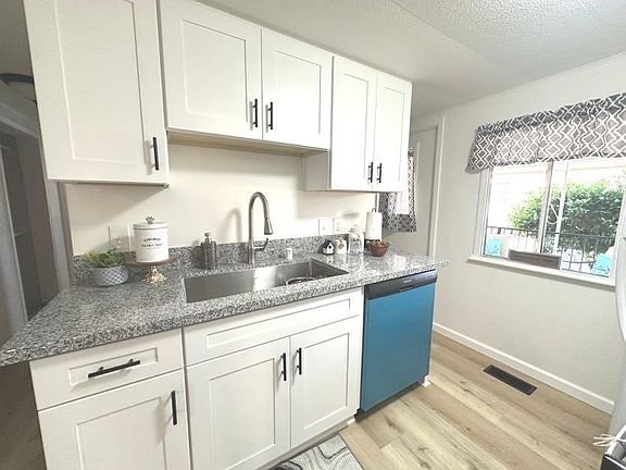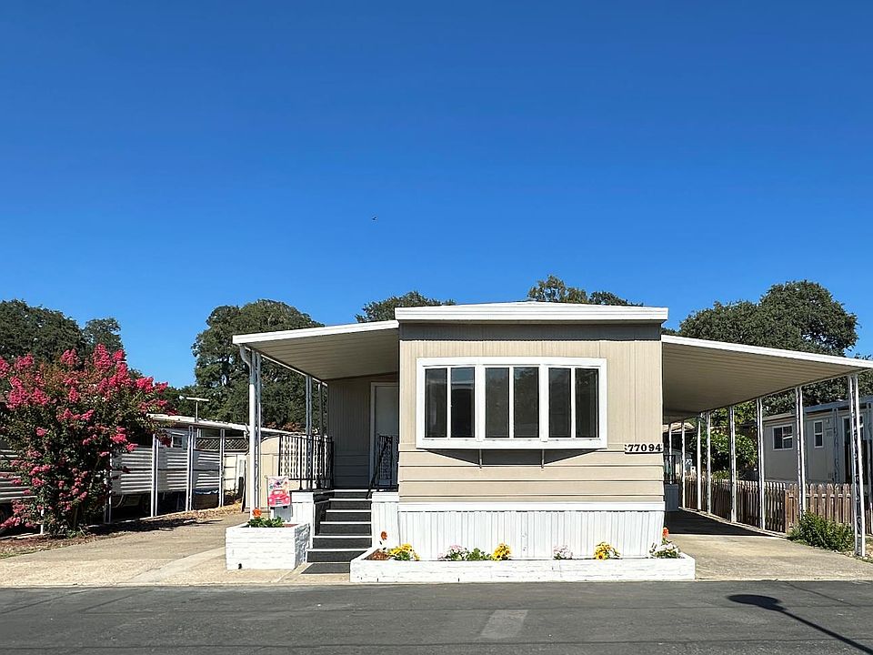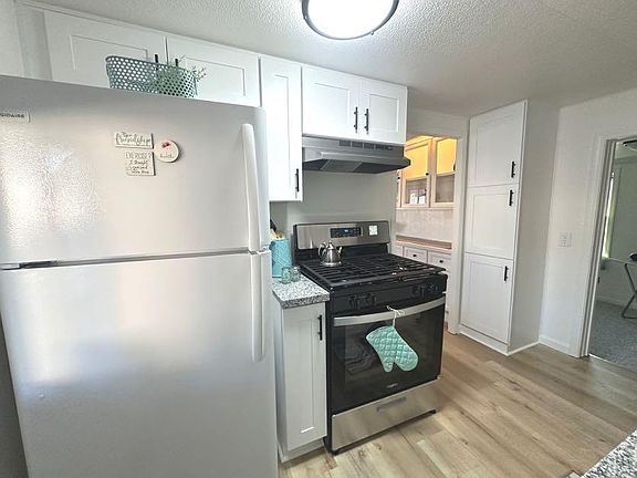 Welcome to Oak Grove Estates, a vibrant 55+ community where comfort and convenience meet! This beautifully updated 3-bedroom, 1.5-bath home features a stunning kitchen with a stainless steel gas range & hood, farmhouse sink, dishwasher, newer refrigerator, cabinets, and granite counters. Fresh paint inside & out, LVP flooring, and cozy carpet give the home a modern feel. One bedroom includes a charming bay window, built-in cabinetry, newer carpet, and a private half bath, while another offers a spacious closet and updated ceiling fan. The full bath has a walk-in shower and updated vanity with plenty of storage. You'll love the indoor laundry with washer & dryer included, plus the large covered patio, carport on one side, and extra parking on the other. Oak Grove Estates offers a clubhouse with a kitchen, BBQ area, and pool, and is just down the street from Rush Park with easy access to shopping, dining, and the freeway! Don't miss the chance to make this beautiful home yours!