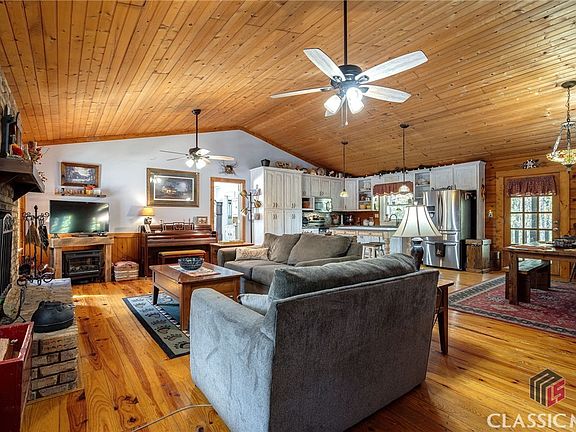 Come take a look at this unique home that's located on 8 acres with a creek! This home offers a surreal setting, a long driveway, and it's like you're in the mountains! This is a rustic log cabin style home with a finished basement, a pool, workshop, garden area, and a spectacular place by the creek for a fire pit and entertaining! This home has a rocking chair front porch, and magnificent covered deck which is perfect for listening to the serene sounds of nature. This home features an open floorplan, beautiful pine floors, and enchanting cedar ceilings. The main level includes the primary suite, plus two additional bedrooms and bathroom. The basement has a large flex room for unlimited uses, a bedroom and bathroom, and another spacious flex room, plus a convenient unfinished area that's perfect for storage. There is also a storage building, chicken coop, and a workshop with a separate power meter. This home is perfect for nature lovers! There are trails throughout the woods, plenty of wildlife, and a flowing creek. The path to the creek is perfect for walking, or riding an ATV. If you're looking for peaceful country living, then this is it! Call today for an appointment.