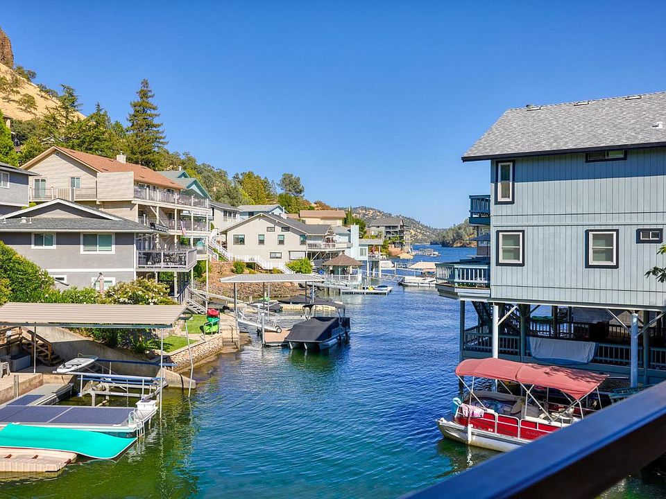 Live the lakefront dream at Lake Tulloch Shores, a fire-wise community with lower fire insurance! Welcome to your ultimate waterfront getaway at Lake Tulloch Shores, a rare family compound featuring TWO LAKEFRONT LOTS, with two private boat docks, and tons of space for guests, toys, rare generous guest parking, and unforgettable memories. Tucked in a cove, the 2,976 sq. ft. home with 4 bedrooms and 3.5 baths offers an open-concept main level with wood floors, fireplace, bar, and a beautifully remodeled kitchen featuring chisled edge granite counters, impressive 6-burner gas stove, a large island with veggie sink, and custom cabinetry. A guest suite, on the street level, including an updated bath is just off the kitchen perfect for your visitors. Enjoy seamless indoor-outdoor living with multiple sliding doors, wrap-around Trex decking, modern cable railings, and multiple locking gates, perfect for lakeside entertaining. Upstairs, the primary suite features jaw dropping cove views and a spacious en-suite bath. Down the separate hall are three additional bedrooms and a third full bath provide comfort and privacy for family and guests. Down by the water, the fun really kicks in. The lower deck, which will take your breath away, just above lake level, is shaded from the hot afternoon sun and set up to party with a built-in island, half bath, cabinets, fridge, and tons of space to hang out, dance, or just chill while the kids play in the water. Below is one of your two private docks, a boat lift and the neighboring lot offers even more lake access including a T-shaped dock for extra boats, paddleboards, swimming, or fishing fun. Keep the second lot or sell it, anyway you win! Nearby enjoy Yosemite, Murphys winetasting, gold panning, or the splendor of quiet times past. Come and fulfill your dreams.