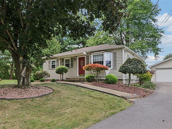 Perfect starter or downsizer! This stylish 3-bedroom vinyl-sided ranch rests on nearly an acre in the peaceful outskirts of Neshannock Township. A paved driveway leads to the 2-car detached garage, while neatly landscaped grounds and a paver sidewalk welcome you to the front door. Inside, a sun-drenched living room highlighted by a bay window, crown moulding, and neutral carpet creates a warm, inviting space. The modern eat-in kitchen boasts crisp white cabinetry, coordinating backsplash, and comes fully equipped. The updated bath features an oversized step-in shower for added convenience. Original hardwood floors enrich the bedrooms, while a beautiful sunroom lined with windows overlooks the level backyard. The lower level offers abundant storage, glass block windows, and a dedicated laundry area. Additional updates include newer windows and roof, ensuring peace of mind for years to come. Move-in ready, minutes to Routes 18, 422,224 and I-376.