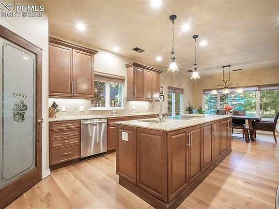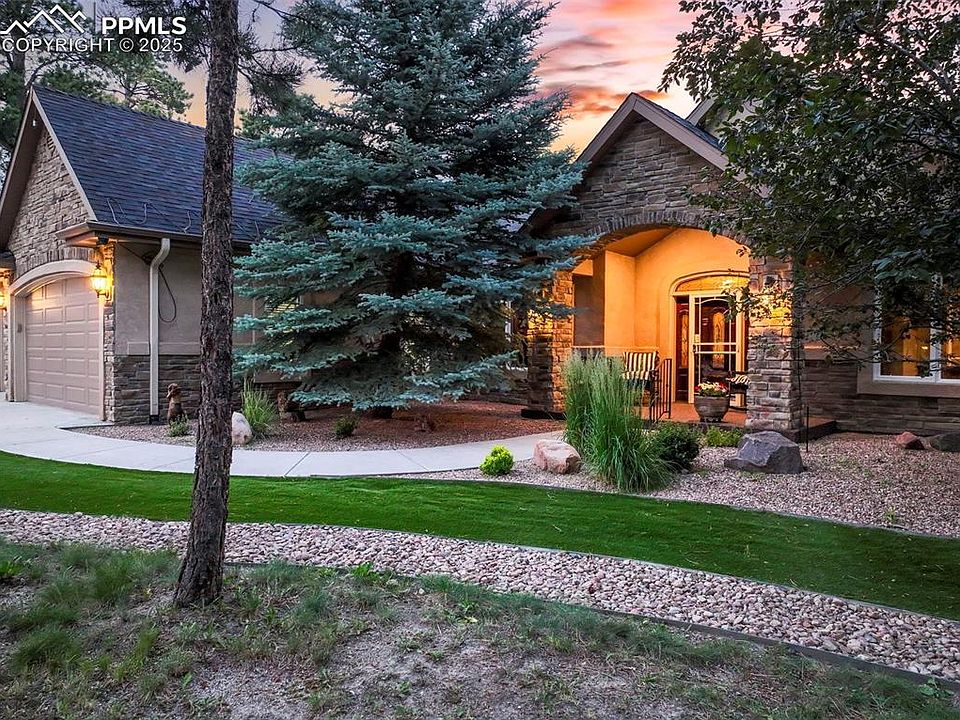 Welcome to serene, single-level living in the coveted Tall Pines Ranch community. Nestled on over 2.5 beautifully treed acres, this ranch-style home offers a rare opportunity for true main-level living with no stairs, combining comfort, luxury, and thoughtful design. Upon arriving, you’ll be captivated by landscaped grounds, inviting covered front porch, & elegant stone and stucco exterior. Inside, you’ll discover an open-concept floor plan highlighted by vaulted, beamed ceilings & natural hardwood flooring throughout. The formal dining room features coffered ceilings. At the heart of the home is the gourmet kitchen, designed with granite countertops, a large center island with prep sink, stainless steel appliances including wall oven, induction cooktop, warming drawer, & cozy dining nook with walkout access to the back patio. The spacious living room boasts a stunning stone accent wall, gas fireplace, & built-in shelving with walls of windows flooding the space with natural light. The luxurious primary suite features vaulted beam ceilings, sitting area, & direct patio access. The adjoining spa-like bathroom offers dual vanities, a large walk-in shower, & an oversized walk-in closet with custom built-ins plus an additional secondary closet. Additional highlights include a dedicated office with French doors & built-in shelving. For convenience, a stylish powder bath with granite countertops, & two additional bedrooms joined by a Jack & Jill bathroom. The oversized 3-car attached garage features epoxy flooring & private workshop with backyard access. A separate detached building offers a utility garage & workshop space with epoxy flooring, perfect for hobbies or possibility to transform into a studio to suit your vision. Enjoy the peace & privacy of the fenced backyard, complete with mature pines & a charming bent tree. Other features included electric awning, storage shed, tree mitigation & Generac generator. This Tall Pines Ranch gem offers endless possibilities.
