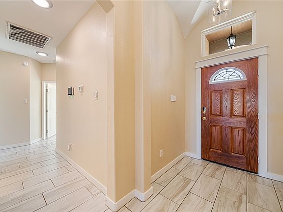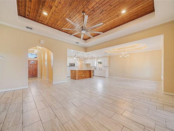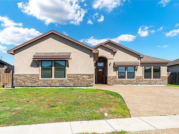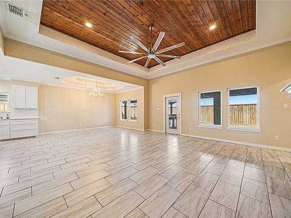 Beautiful custom-built 4-bedroom, 2.5-bath home featuring a front wrap garage and open-concept design. The gourmet kitchen boasts quartz countertops, double ovens, a wine bar area, beverage refrigerator, two pantries, and a large island ideal for entertaining. The spacious primary suite offers comfort and style, with tile flooring throughout the home. Enjoy two patios with a full outdoor kitchen and a separate storage building. The finished garage includes a storage room and attic with stair access—perfect for extra organization and convenience.