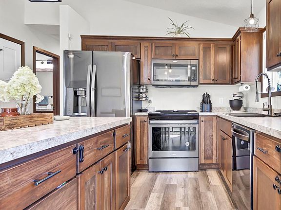 The open-concept main level features vaulted ceilings, a spacious kitchen with a large center island—perfect for entertaining or everyday living. Step out from the dining room onto a 16x12 deck that overlooks the backyard, ideal for relaxing evenings or weekend gatherings.