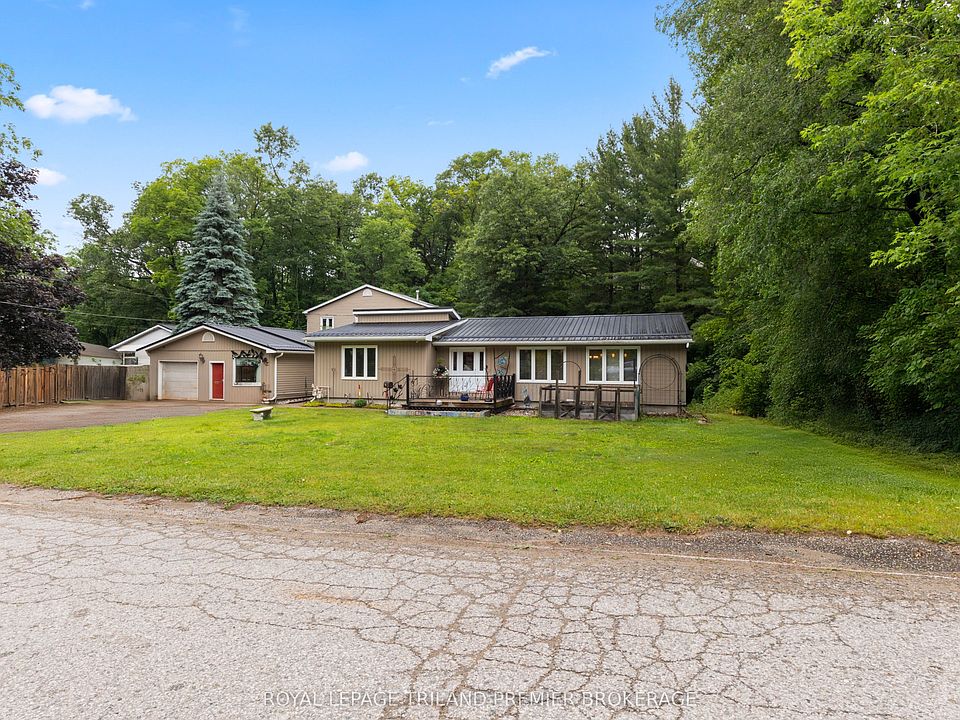 Unique Residential & Commercial Opportunity in desirable Port Franks! Welcome to this beautifully maintained and updated bungalow nestled in the charming lakeside community of Port Franks. Situated on a quiet treed lot, this property offers incredible potential for homeowners, investors, business owners or a combination to suit any buyer. The spacious main home features a bright and airy open-concept layout boasting a large kitchen loaded with storage, stainless steel appliances and wrap around island with two-tier breakfast bar; 2 bedrooms and 2 full bathrooms including primary suite with walk in closet and spa-like ensuite; living room with laminate flooring; dinette with direct access to the backyard; main floor laundry; and office space with built-in shelving. Enjoy your morning coffee and the sounds of nature in the private treed backyard or on the generous front deck. A large detached garage/workshop has 200amp service, 2-piece bathroom, and sink with counter and shelving providing ample space for hobbies, storage, parking or entrepreneurial use. At the rear of the property, you'll find a two-storey dwelling with two self-contained, and fully furnished apartment units with shared laundry hook-up, including main floor one bedroom unit and upper unit with two bedrooms plus den, kitchen with dishwasher hook-up, along with private deck - ideal for rental income or visits with extended family. Whether you're looking for a peaceful home base, an income-generating property, or a unique business opportunity, this one-of-a-kind property offers endless possibilities in a sought-after location near beaches, trails, and amenities. Dwellings are all well insulated, 2 operate. septic (apartment & shop share one). Updates include: Furnace and A/C 12 yrs, metal roof 10 yrs, shop metal roof 6 yrs, windows and exterior doors 13 yrs, kitchen 13 yrs, main bath 12 yrs, ensuite 7yrs, extension on rear of home 13 yrs, soffit and fascia 13 yrs, gazebo 3yrs (all ages are approximate).