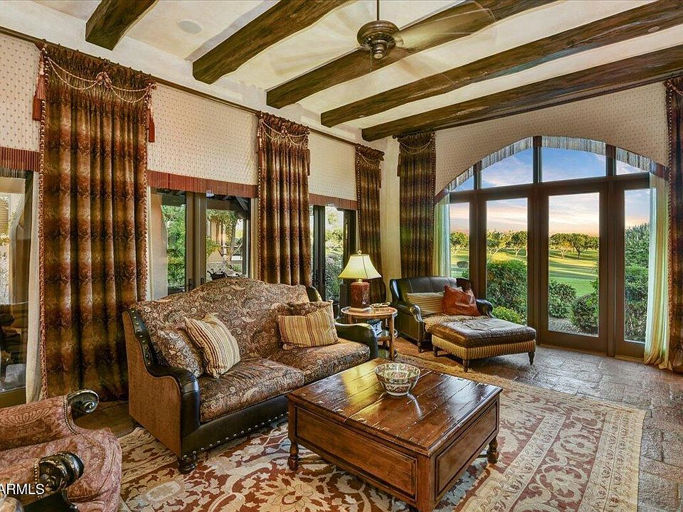 Offered fully FURNISHED, TURN KEY, this ONE OF A KIND villa is more than a home. It's a lifestyle of luxury without maintenance. A magical experience begins in the front courtyard with fountain, lush greenery, music & custom lighting. Chef's dream kitchen features premium Miele & Wolf appliances: built-in espresso maker, steam oven, dual convection ovens, two warming drawers, dual Bosch dishwashers. The 48'' Viking grill has both searing and rotisserie units. Eat well, rest well! Bedrooms built with soundboard ensure quiet. Rich wood beams, stately Cantera stone fireplaces. This home has views of two different fairways. Premier, private Superstition Mountain Golf & Country Club has 36 holes of Jack Nicklaus designed golf. Pickle ball & other social activities available with membership. 24/7 attended gated entrance. 40 minutes to Sky Harbor Airport, 20 minutes to Mesa Gateway Airport, 20 minutes to medical, retail and dining, 15 minutes to hiking trailheads.