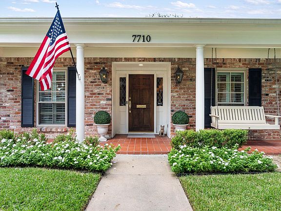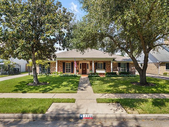 Classic Briarmeadow residence thoughtfully reimagined. 7710 Pagewood Lane is a 4bed/2.5 bath home sitting on a 9,500 (HCAD) sqft lot. The home features a lovely porch with gas lanterns, formal entry with grass cloth, dedicated dining & living rooms, plus a large family room with vaulted ceilings. The open kitchen has a raised ceiling with custom cabinetry, quartzite countertops, and stainless steel appliances. Sit comfortably at the barstool seating or built-in breakfast banquette. Head outside through the renovated mud/laundry room and you’ll find an expanded covered patio overlooking the large back yard. The garage has been converted for usable square footage with AC, but may be used as a traditional garage if desired. All bedrooms located on right wing of the home. Both full bathrooms feature marble countertops, primary bath has separate tub and shower! Full home generator. Schedule your showing today! Per Seller