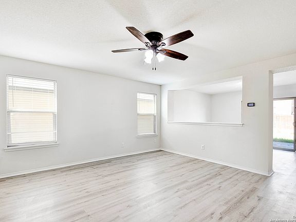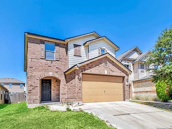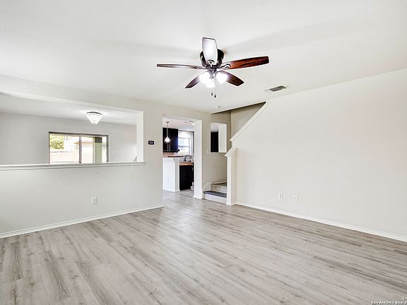 Step into this inviting two-story home filled with natural light and designed for comfortable living. A spacious living room welcomes you in, while the dining area flows seamlessly into the kitchen-perfect for both everyday meals and entertaining. The kitchen stands out with butcher-block countertops, bold black cabinetry, a large pantry, and a breakfast bar for casual dining. Upstairs, a versatile secondary living space offers room for a game area, playroom, or lounge. The primary suite provides a relaxing retreat with vinyl flooring and full bath featuring a double vanity, natural light from a well-placed window, and a large walk-in closet. Two additional bedrooms and a full bath complete the upstairs layout. Outside, enjoy a partially covered, extended patio-ideal for grilling, relaxing, or gathering with friends or loved ones. With quick access to IH-10 and just a short drive to Randolph AFB, shopping, dining, and entertainment, this home blends convenience with everyday comfort.