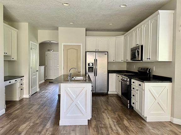 Outside you'll find a large front porch and backyard patio to relax on. Garage is extra deep and wide for plenty of storage/large vehicles and features built in lockers. Well cared for yard includes garden, trellis, fruit trees and berry bushes including: apple, peach, cherry, grapes, raspberries, strawberries, elderberry, goji berry and herbs. Large greenhouse has power and water. Insulated garage door and smart garage opener with camera. Also, third car drive for extra parking and custom smart holiday lighting for your favorite holidays and games. Don't forget the miles and miles of mountain biking and hiking trails just a few hundred yards away. Beautiful parks a short walk as well.