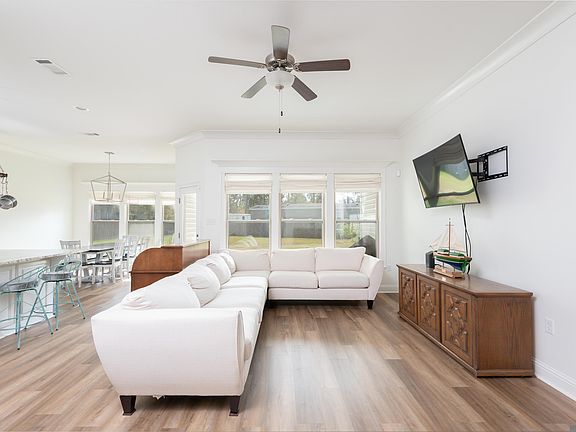 (FLOOD ZONE X!) Step inside this beautiful 4-bedroom, 2-bath home offering just over 2,000 sq ft of comfortable living space. Situated on one of the larger lots in the neighborhood, this home welcomes you with a foyer entry, tall ceilings, and elegant crown molding in the main living areas. The kitchen features 3cm slab granite countertops, a large island with side outlets, subway-style decorative backsplash, a stainless steel single-bowl under-mount sink, stainless steel appliances, and a walk-in pantry for ample storage. The kitchen flows seamlessly into the dining and living spaces, which are filled with natural light and finished with upgraded warm laminate wood flooring. Fresh paint in the main areas of the home as well. The primary suite offers a relaxing retreat with a bathroom equipped with a soaking tub, a separate shower, granite-topped vanities with under-mount sinks, and a spacious walk-in closet. Three additional bedrooms feature plush carpet and share a full bathroom. A mudroom off the garage entrance adds everyday convenience, while the large backyard provides plenty of room to relax or play. An additional 8x6 storage room with a roll-up door is located near the back patio and is perfect for storing lawn/gardening tools. This home perfectly blends style, comfort, and function—ready for you to make it your own!