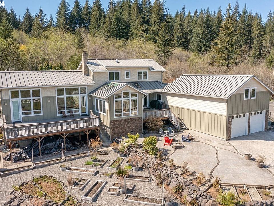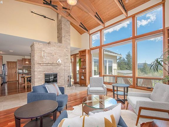 Breathtaking gated 5-acre custom estate, where unobstructed views of Mt. Hood and serene frontage on the Little Washougal River create a backdrop of unparalleled natural beauty. This one-of-a-kind residence showcases exquisite craftsmanship and thoughtful design throughout its layout. Enter a world of elegance and warmth highlighted by custom scissor trusses and rich, engineered Tigerwood flooring that extends across the main living areas. Every detail reflects a commitment to quality, from the solid wood doors and wood-clad windows to the primary suite on the main level offering the ultimate in comfort with radiant heated floors, a walk-in tile shower, and custom-built ins for ample storage. The heart of this home is its open and inviting living room, the warm fireplace and wall of windows to gaze outdoors. The sunroom provides a perfect spot for morning coffee or evening relaxation, while the adjacent outdoor hot tub invites you to unwind under the stars. Functionality meets luxury with three bedrooms and a versatile bonus room that can serve as an additional bedroom, media room, or restful place. Dual offices cater to the needs of remote professionals or creatives seeking inspiration from their tranquil surroundings. Outdoor living is equally impressive, with an auto drip system for easy landscape maintenance, ensuring your surroundings remain pristine with minimal effort. A substantial 24x42 heated shop with a bathroom, shower, and roll-up doors offers endless possibilities for hobbies, storage, or an expansive home business setup. And with a generator on standby, you'll enjoy peace of mind regardless of the weather. offering a rare blend of seclusion and convenience, making it a true sanctuary for those who appreciate the finer things. Whether you're hosting gatherings, exploring your vast property, or simply soaking in the views, this Camas estate promises a lifestyle of unparalleled luxury and serenity.