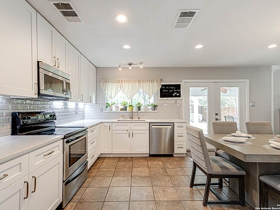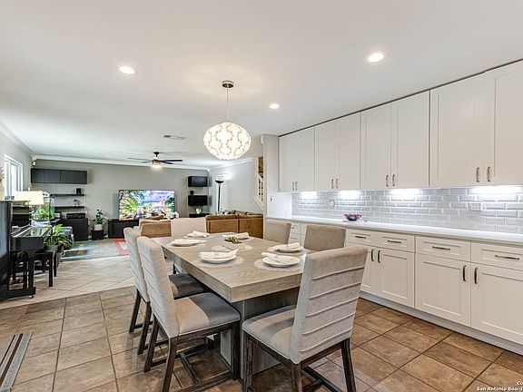 MULTIPLE OFFER RECEIVED! Best & Final Offer due July 14th 5:00 PM. Nestled in the desirable Oak Bluff subdivision, this well-maintained two-story home offers the perfect blend of comfort, functionality, and style. Located in a quiet street. With five well-proportioned bedrooms and two and a half bathrooms, there's ample space for both everyday living and entertaining. The open-concept layout flows seamlessly through the main living areas and features easy-care laminate and tile flooring, with carpeting limited to only a few closets-making this home especially low-maintenance. The grand, upscale kitchen is a true centerpiece of the home, offering ceiling-height cabinetry for added elegance and storage, sleek quartz countertops, stainless steel appliances, and a classic subway tile backsplash that adds timeless charm. Beautiful Crown molding. French doors open directly to the private backyard, creating an inviting atmosphere. Step outside to a covered patio and a large backyard filled with mature trees and a flourishing vegetable and herb garden. The primary bathroom features an elegantly renovated walk-in shower and granite countertops. The secondary bathroom and powder room are enhanced with tasteful travertine backsplash, solid countertops, and designer-style cabinetry-adding a touch of natural elegance. This home has been thoughtfully updated over the years, including a new roof and siding (2016), window replacements (2020), new water heater (2023), HVAC system replacement (2024), and fresh paint upstairs (2025). Additional highlights include direct access to O.P. Schnabel Park, a beautiful nature preserve with trails, sports fields, and recreational amenities-ideal for outdoor enthusiasts. The home has been covered under a Choice Home Warranty for the past two years. Located close to USAA, UTSA, La Cantera, The Rim.